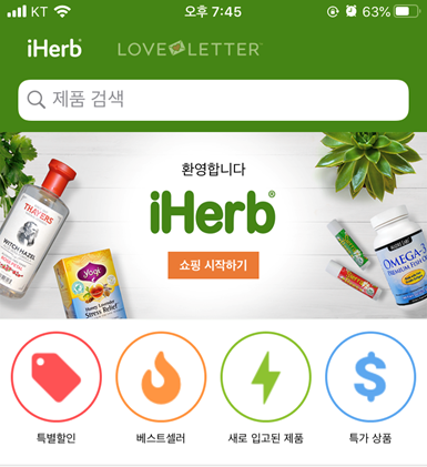 iHerb를 실행하면 아래화면과 같은 메인화면을 보실 수 있으며, '제품 검색' 란을 통해 원하는 제품을 검색하실 수 있습니다.