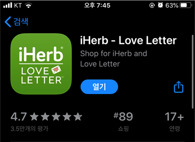 애플 App Store에서 '아이허브' 또는 'iHerb'를 검색하면 아래 그림과 같은 어플리케이션을 찾으실 수 있습니다.