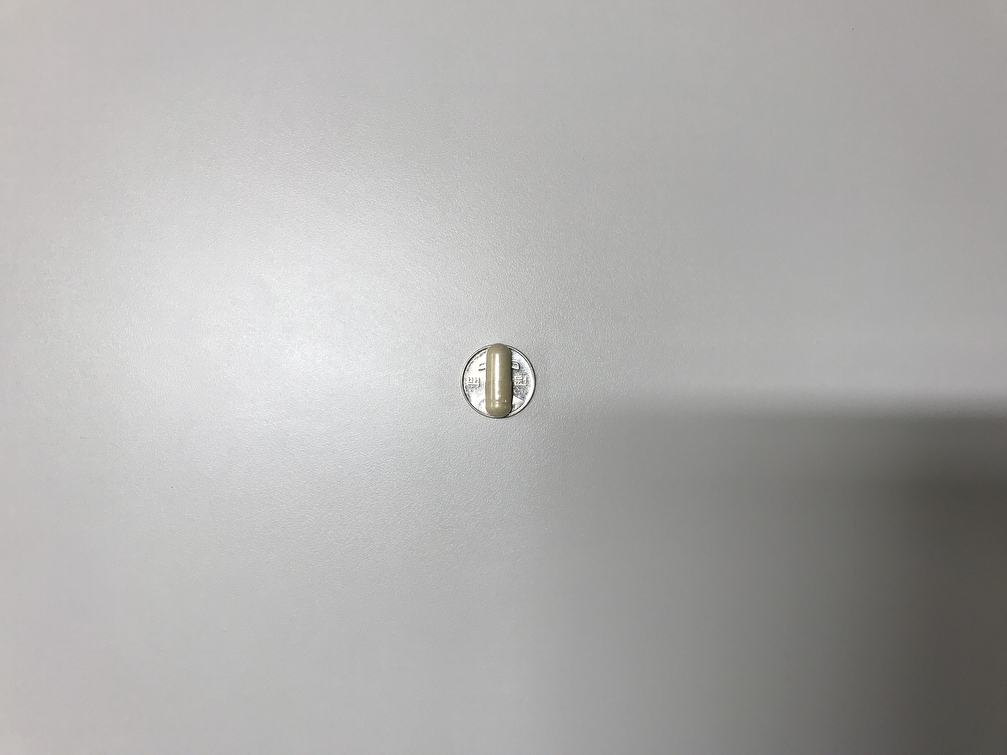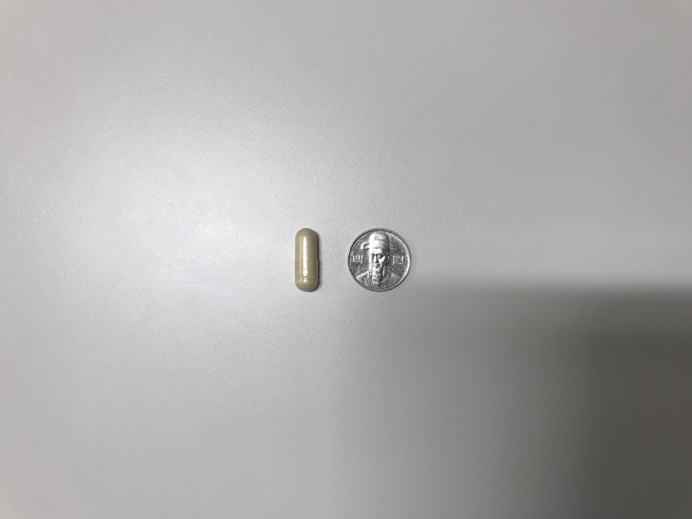 크기는 지름 2.65cm의 백원짜리와 거의 비슷합니다. 쏜리서치 투퍼데이 제품은 이름처럼 하루 2캡슐을 복용하여야 하는데 한 번에 두 캡슐 모두 삼켜도 큰 무리는 없을 것이라 생각이 듭니다.