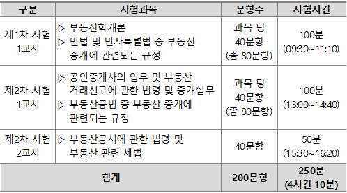 공인중개사 시험은 총 5개 과목으로 구성되어 있습니다. 또한, 1차 시험과 2차 시험으로 나뉘어 있으며 각 80문항 및 120문항으로 총 200문항으로 이루어져 있습니다. 시험내용으로는 제 1차 시험이 부동산학개론 및 민법 및 민사특별법으로 구성되어 있고, 공인중개사의 업무 및 부동산 공법 등으로 제 2차 시험이 구성되어 있습니다. 시험시간은 각 과목 당 50분 및 총 250분으로 꽤 긴 시간 동안 시험을 쳐야합니다.
