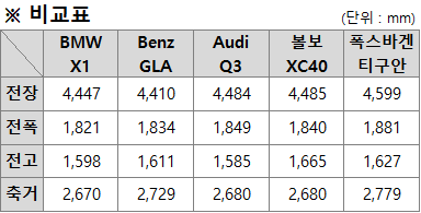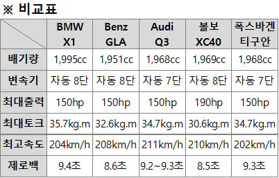 - 주요 제원 및 성능 비교는 볼보 XC40을 제외하고는 모두 2020년도 2,000cc 디젤 모델을 기준으로 비교해 보았습니다.
